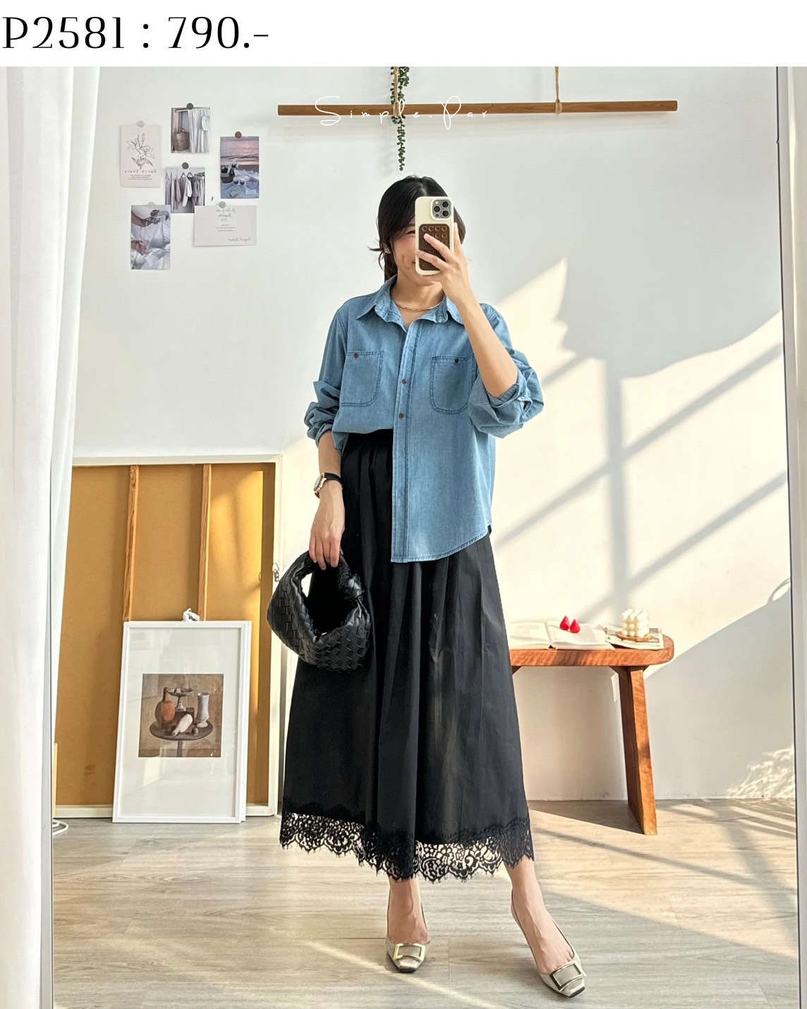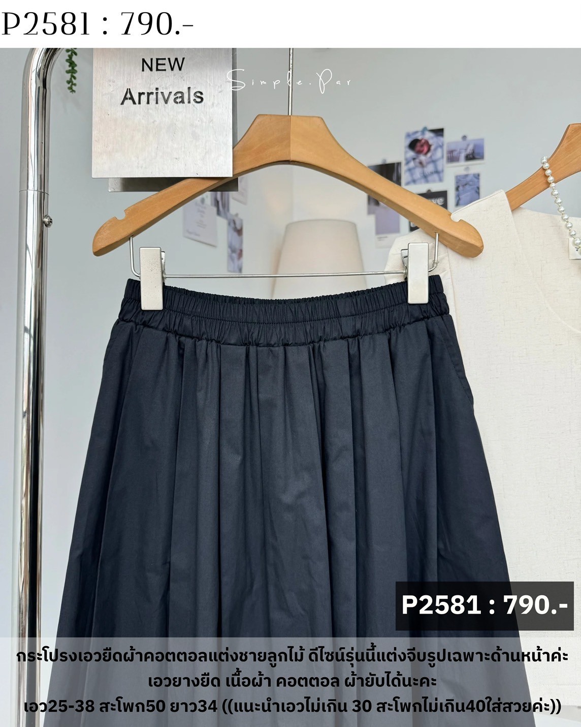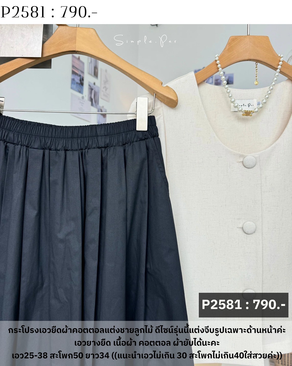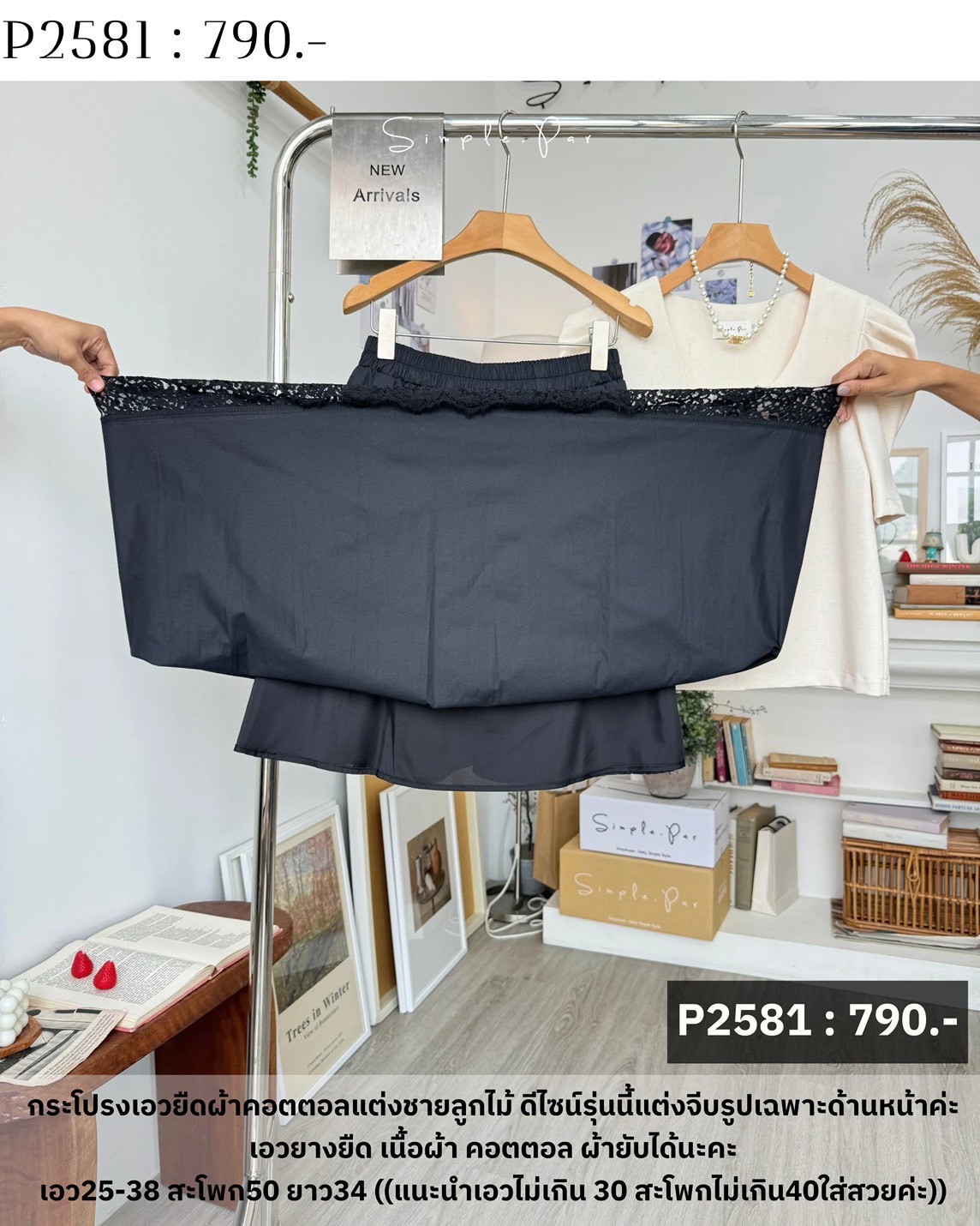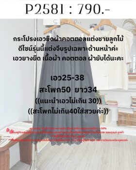 P2581 : กระโปรงเอวยืดผ้าคอตตอลแต่งชายลูกไม้